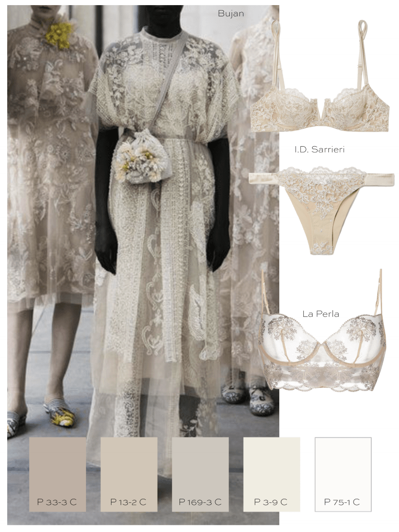 This bohemian trend draws inspiration from vintage lace techniques, such as, bobbin lace, needlepoint lace, and Brussels lace. Patchwork lace was seen on the runways of Christian Dior and Isabel Marant, while Fendi showed cotton bastiste embroidered grounds inspired by Valenciennes hankerchiefs. Think beautiful intricate, delicate cotton lace and embroidery in a monochrome palette for Spring 2022 lingerie.