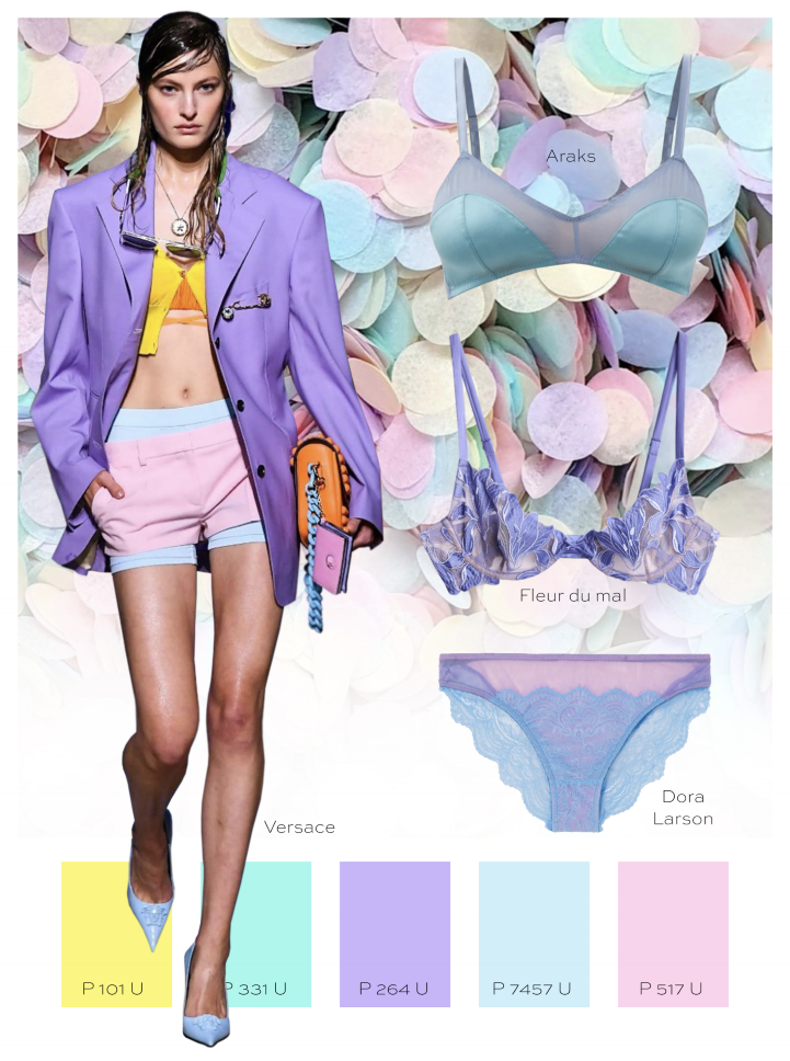 Sorbet-inspired colors continue to dominate, and they suit a wide range of skin tones. Designers (see Versace) are using matte fabrics in cotton candy pastel colors in an update of this 90’s trend. Lingerie designer, Dora Larson, elevates the aesthetic of her designs by combining pastel tones. Create delectable sugar confections for Spring 2022 in optimistic colors: lavender, yellow, powdery blue, pink and turquoise.