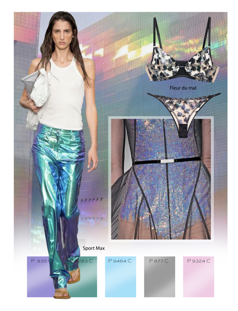 This space-age style rebirth begins with materials that are innovative in both appearance and performance. Color changing pigments of holographic colors add a modern and futuristic touch. A hologram is a photograph of light that is scattered from an object and displayed in a three-dimensional way; these can be integrated into digital print design. Foil-effect fabrics have a shimmering, fluid-like effect, and iridescent threads are used in embroidery designs. This future fitness trend in fashion combines fashion with utility and function, such as, quick drying fabric.